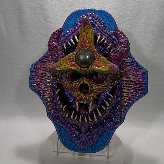 In the distant future, on a planet where the barriers between dimensions have fractured, the Eye of Gorok was unearthed—a relic of a forgotten war between gods and cosmic entities. Legends speak of Gorok, a celestial warlord who once sought to devour the fabric of reality itself. His essence was sealed within this terrifying artifact, a fusion of organic terror and metallic otherworldliness, pulsing with arcane energy. Those who dare gaze into the eye are said to see glimpses of parallel worlds, distorted nightmares of what could have been. It is both a key and a warning, a relic too dangerous to destroy yet too powerful to ignore.