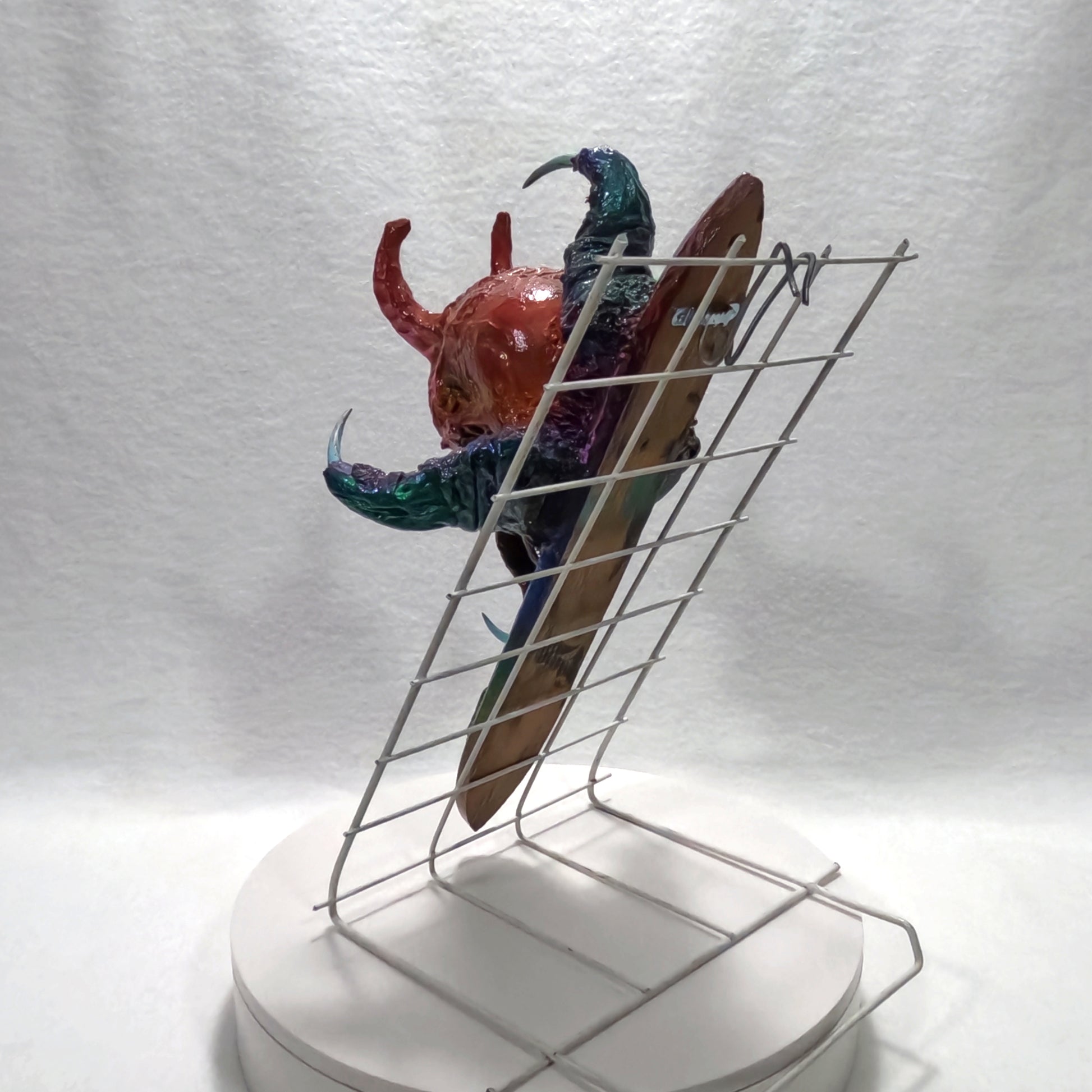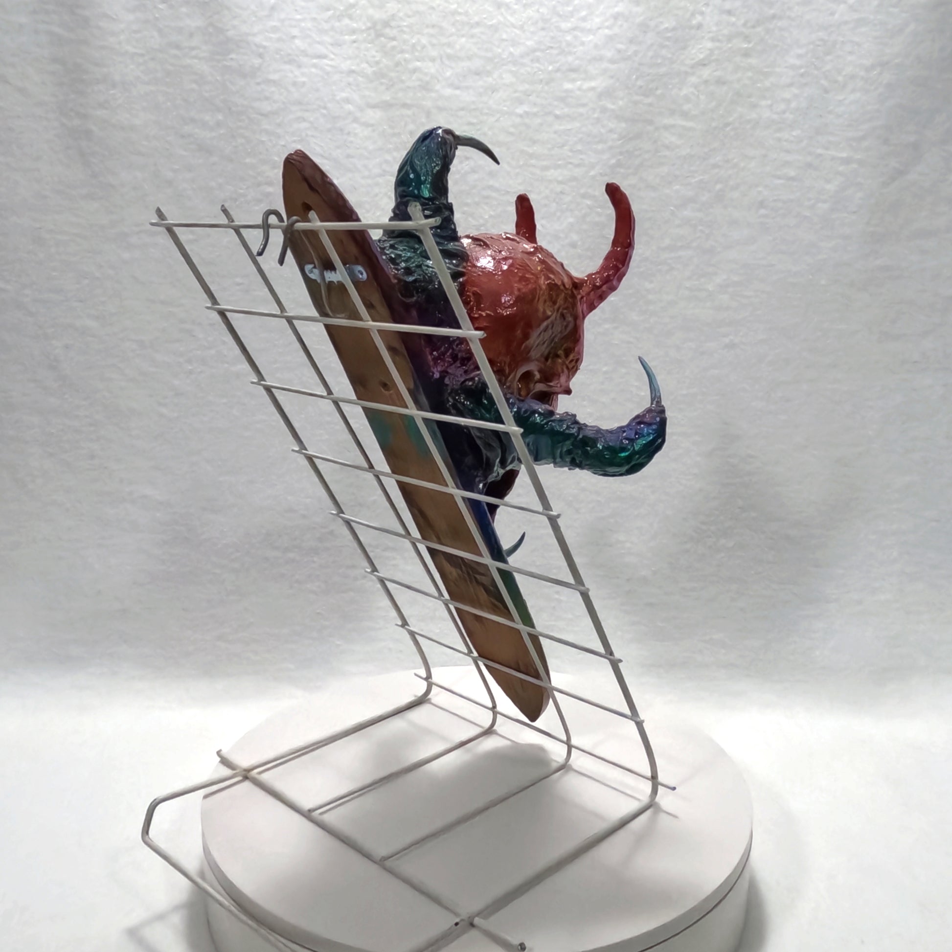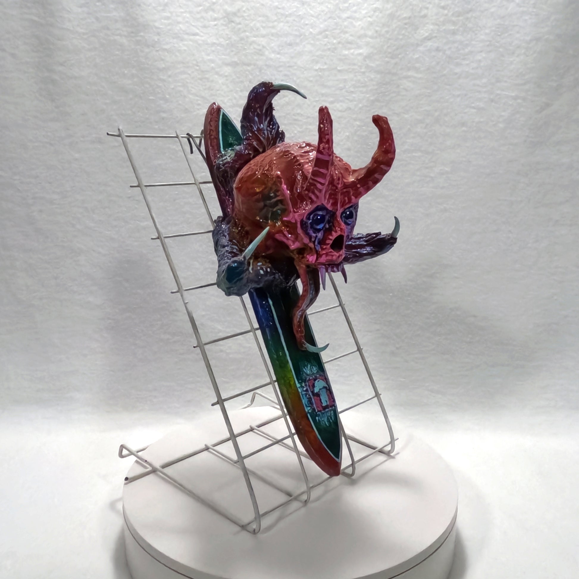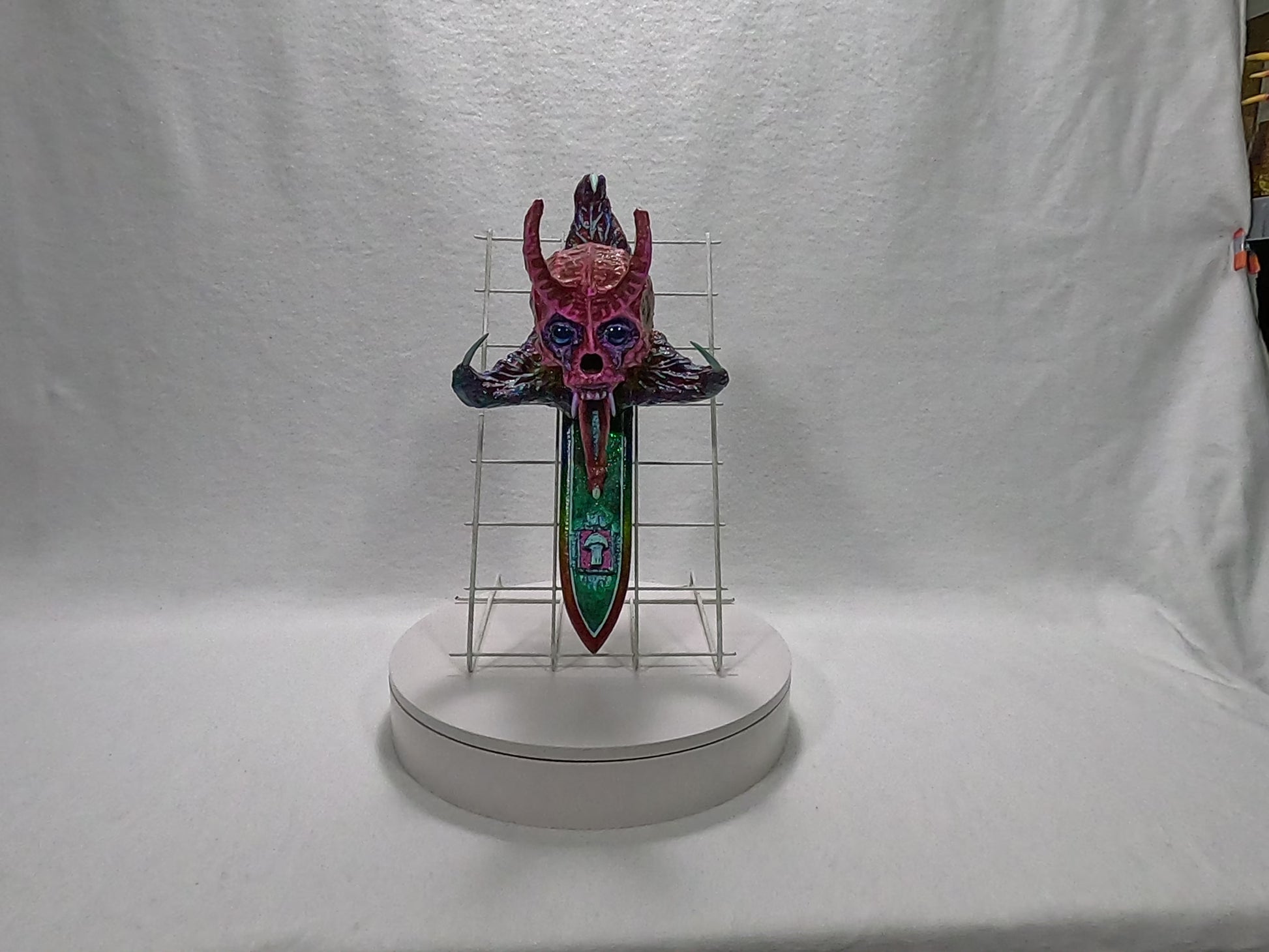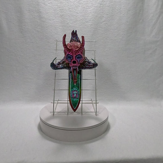 The artifact before you, Transmogrifier of Souls, a sinister fusion of demonic visage and ritual blade, is said to possess an insidious power—an ability to siphon the very essence of those who fall under its gaze. Once an individual locks eyes with its eerie, soul-piercing stare, a spectral force reaches forth, drawing out their life’s energy and corrupting it with the taint of the abyss. This transformation is neither swift nor merciful; it twists the victim’s spirit, replacing purity with malevolence, and reshaping their existence into an echo of the darkness that birthed the artifact itself.