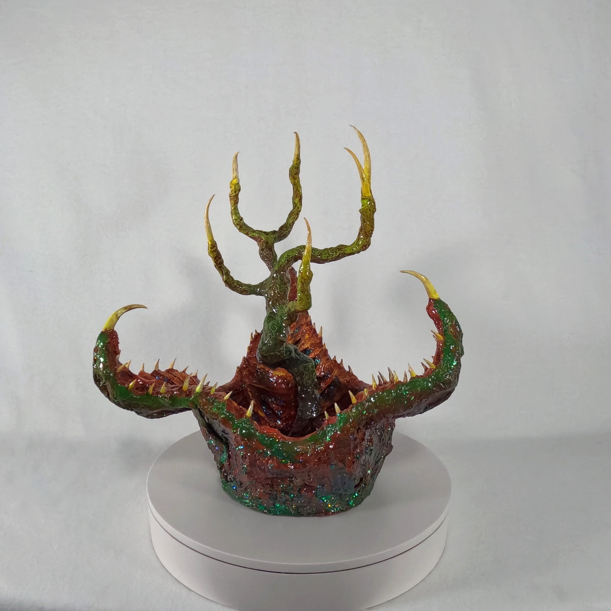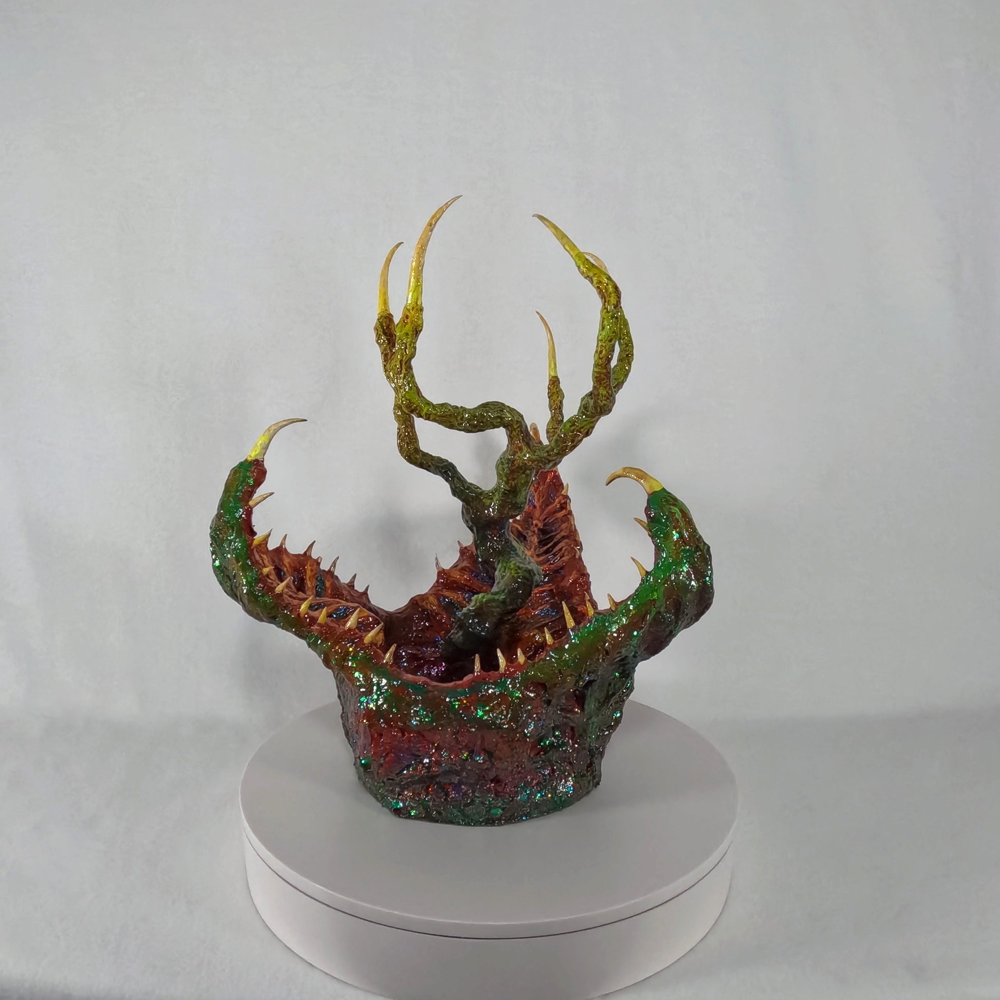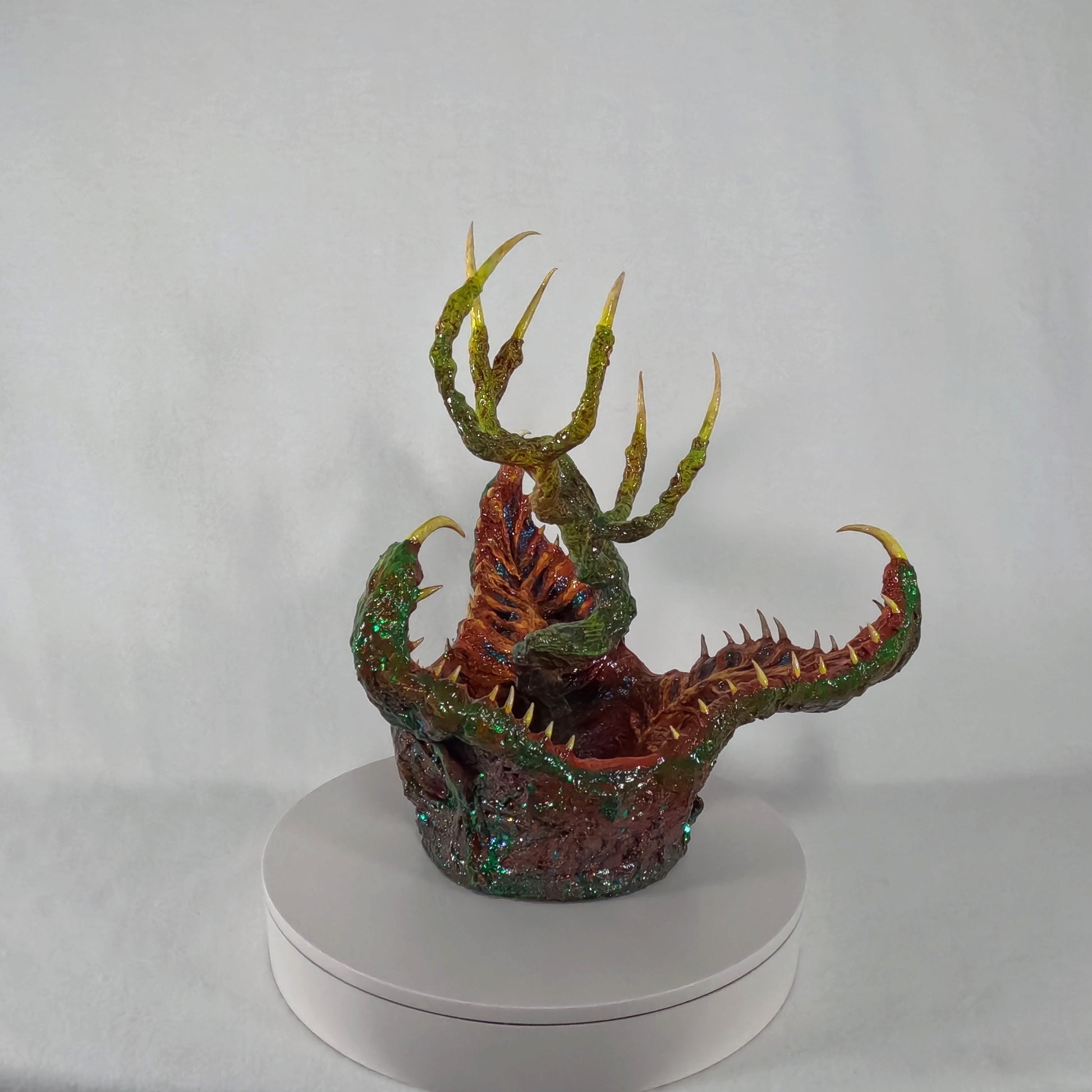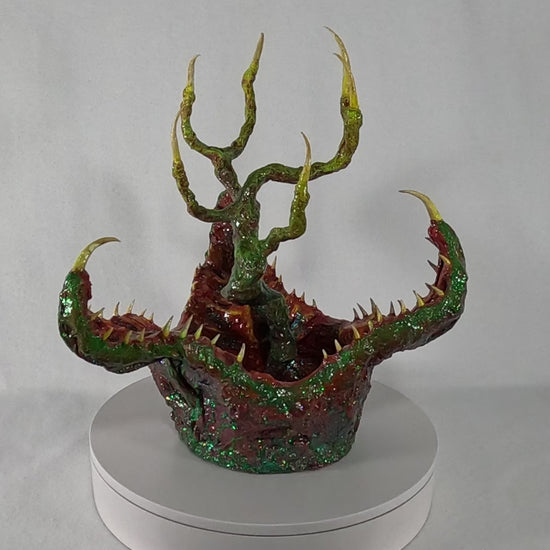 Dr. Elias Voss and his research team first encountered the creature while navigating the murky wetlands of Gliese-581g, a swamp-covered exoplanet teeming with unknown life. Dubbed the Tree-Tongued Cannibal Cabbage, the organism emerged from the water, its gnarled, root-like appendages extending like skeletal fingers, while its jagged, crimson-lined maw gaped hungrily at their presence. Motion sensors detected rapid movement beneath the surface, suggesting an unseen network of tendrils, likely used for anchoring and detecting prey. When a drone attempted to collect a tissue sample, the entity reacted with lightning speed, snapping its fanged petals shut, severing the robotic arm instantly.