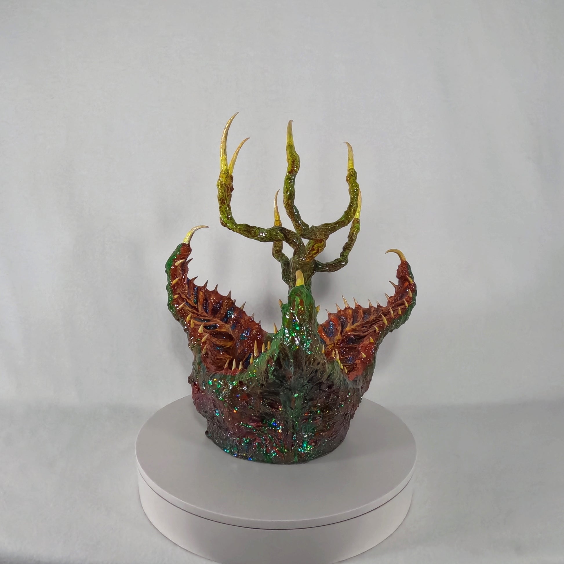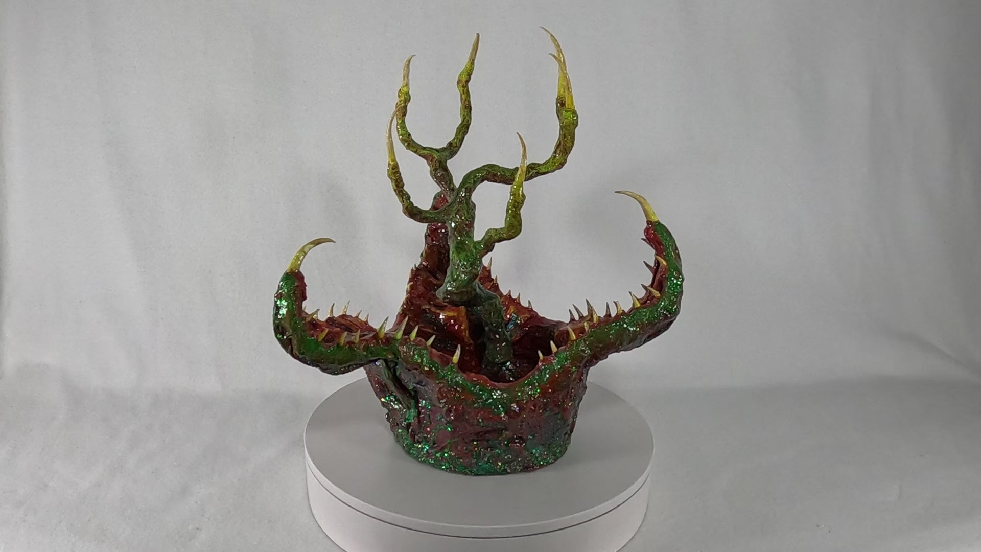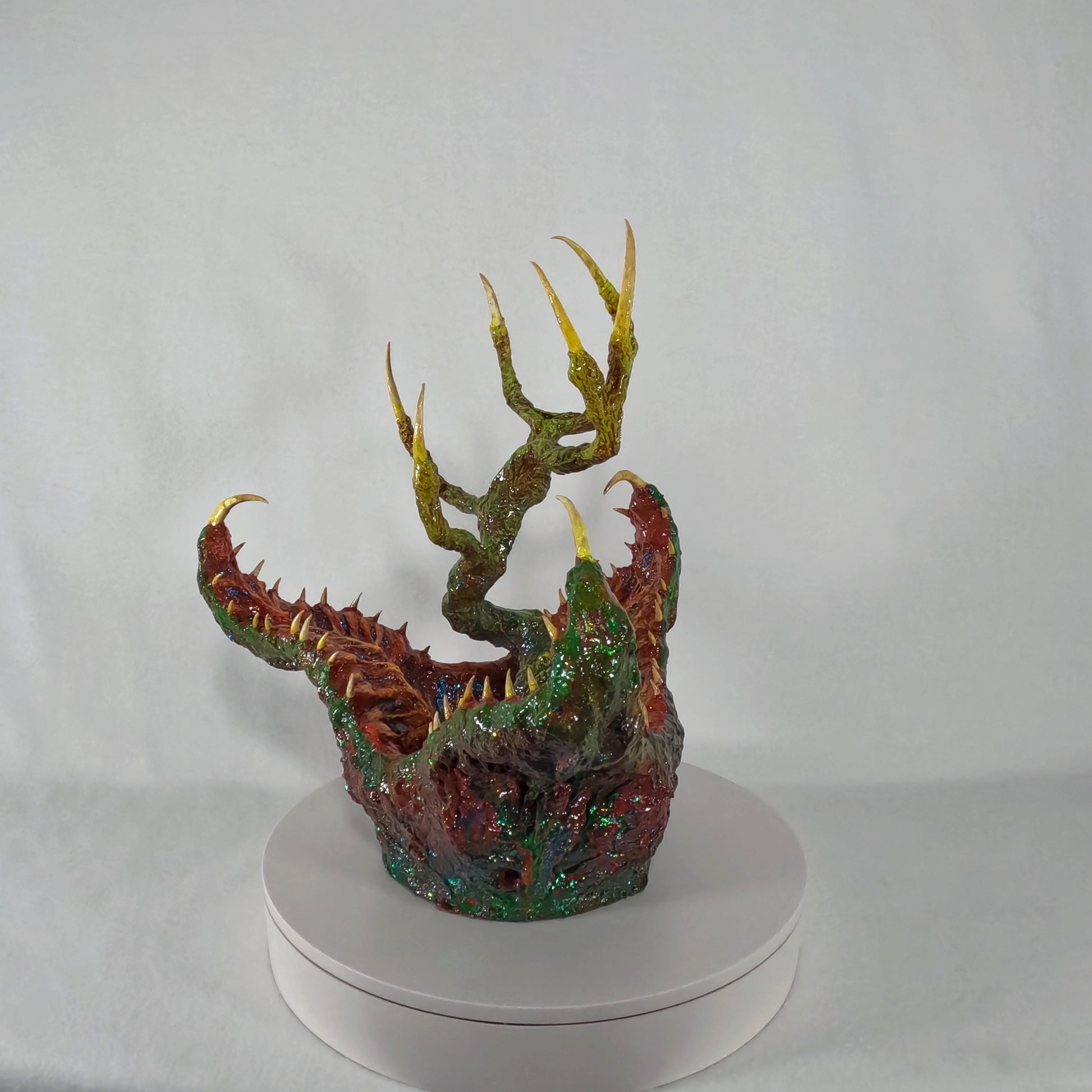 Dr. Elias Voss and his research team first encountered the creature while navigating the murky wetlands of Gliese-581g, a swamp-covered exoplanet teeming with unknown life. Dubbed the Tree-Tongued Cannibal Cabbage, the organism emerged from the water, its gnarled, root-like appendages extending like skeletal fingers, while its jagged, crimson-lined maw gaped hungrily at their presence. Motion sensors detected rapid movement beneath the surface, suggesting an unseen network of tendrils, likely used for anchoring and detecting prey. When a drone attempted to collect a tissue sample, the entity reacted with lightning speed, snapping its fanged petals shut, severing the robotic arm instantly.